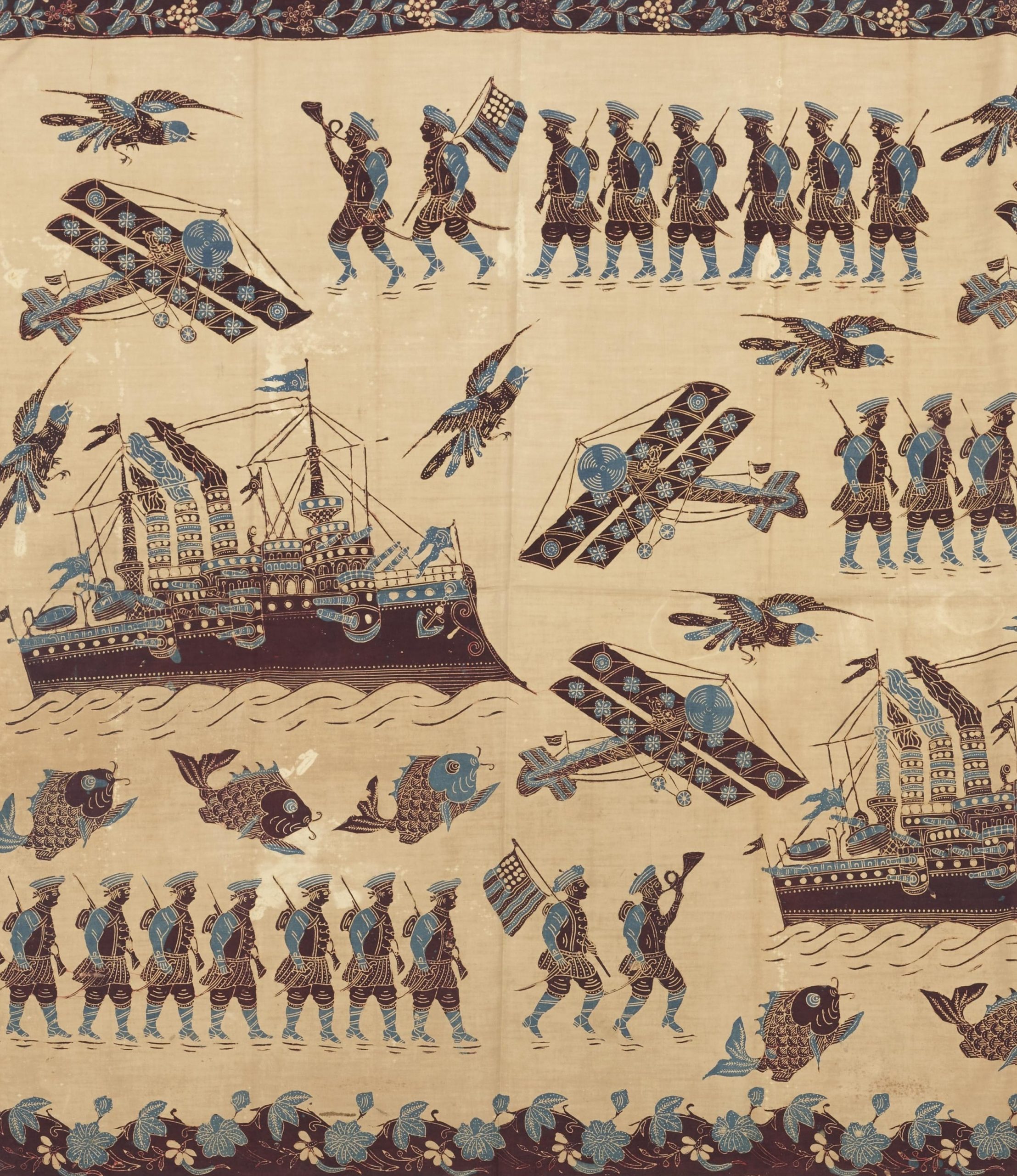 現在開催中の「一杉コレクション展-魅惑のインドネシア染織-」(~3月15日)の出品作品に、よくみると星条旗(らしきもの)が!出品番号62番《戦争シーン文様更紗腰衣》は、いわゆる「カイン・コンパニ」と呼ばれる、兵隊や船、飛行機が染め出されたバティックですが、隊列を組む兵士の先頭に、進軍ラッパを吹く兵士と旗を掲げる兵士が描かれています。最初は、ただ旗が描かれていると気にも留めなかったのですが、どう見ても星条旗。しかも、19世紀初期の星(州)の数が少ない頃の。しかし、なぜオランダの旗でなく、星条旗なのでしょう。確かにアメリカの商船はバタビア(ジャカルタ)に出入りしてはいましたが…。一方で大きな蒸気船の旗をよく見ると、月と星が描かれていて、イスラムの国からの船かと思わされます。この布の持つ物語はいまだ紐解けていません。どうか、なにかご存じのことがあれば、ぜひ教えてくださいませ。