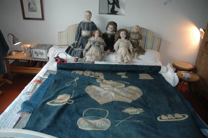 ヴィリエ=ル=バクルは、花にあふれた小さな村でした。村の入口から歩いて少しの場所にあるメゾンは、隅々までフジタの手作りの品々に満たされ、おとぎの国のように愛らしい家でした。フジタの寝室に通されたあと、アン・ル=ディベルデル館長は別室に消え、紙に包まれたチューブを持ってこられました。そこに巻かれた布が、フジタが使ったベッドの上に、くるくると広げられ、藍染の布が姿を現した時、なんとも言えない感慨がありました。大切に保管されていた筒描との出会いを含め、メゾンに来ることがなければ、どれほど彼が布好き、裁縫好きであったかも実感できなかっでしょう。