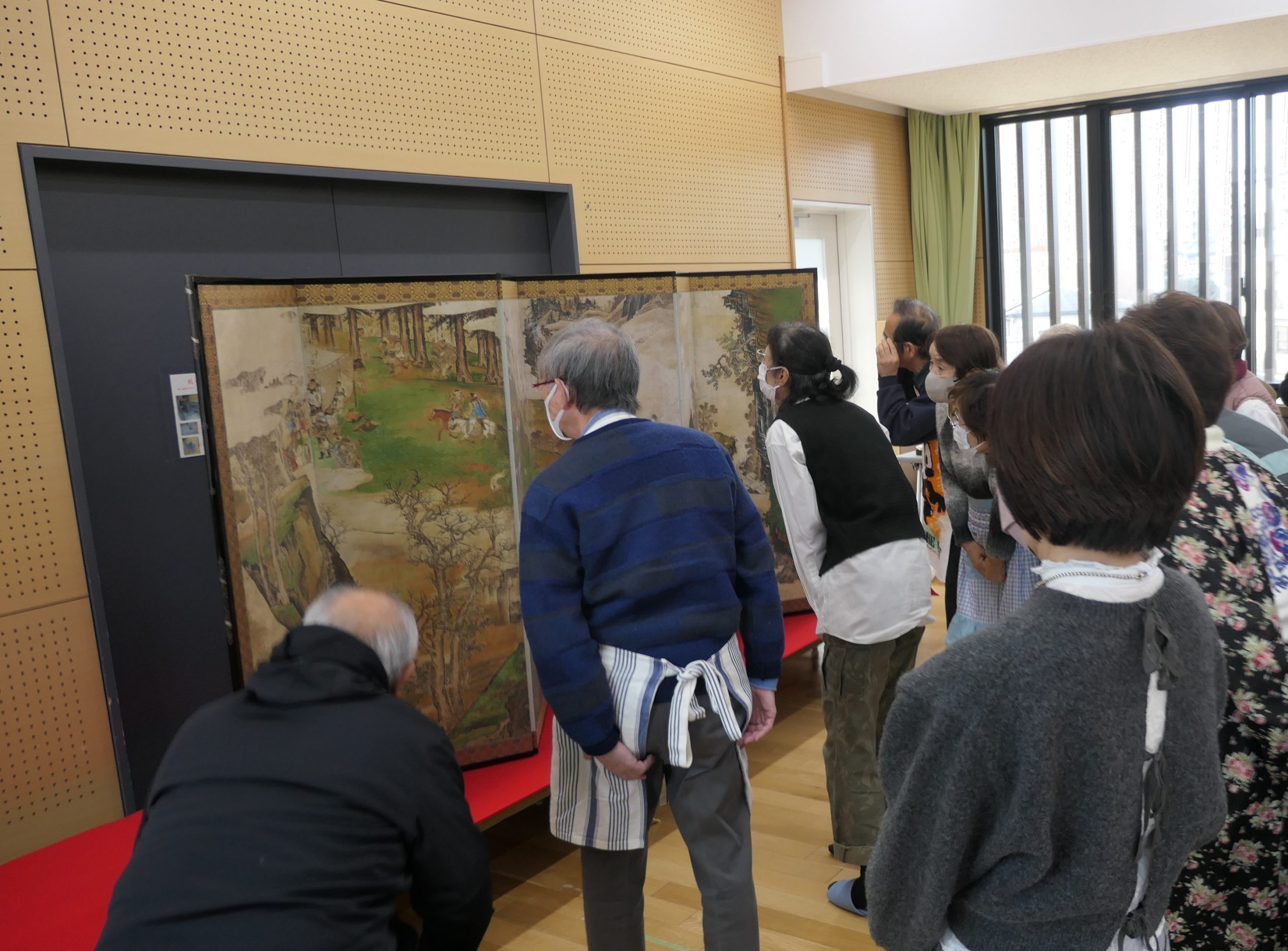 対話型鑑賞は、まず屏風を箱から出すところから始まります。参加者の方は外箱、収納袋から屏風が出されて、広げられる様子をじっと見つめます。屏風が広がると、表れた画面に「おお。」と静かな歓声があがります。屏風には、大きな岩や断崖のある風景の中で、たくさんの人々が何頭もの馬に乗って弓を持ち、走り回っている様子が描かれています。屏風が大きいので、みなさん右や左に移動しながらじっくり見ます。スタッフからの「じっくり見て、何か気がついたことはありますか?」という問いかけで、会話しながらの鑑賞がスタートします。「被っている帽子が日本にはない形だから外国の様子だろう」「足が縛られた動物が描かれているから、戦いではなく狩りをしたのではないか」と描いてあることをもとに国や場面を想像して参加者同士が伝え合います。すると、「私も戦いではないと思う。陣営を構えている人の顔に緊張感がなくほがらかだから」と意見が繋がっていきます。「え!見てなかった!」「それなら、こうじゃないかな?」と他の方の意見によって新たな気づきがあり、参加者の方々はどんどん作品に惹きつけられていきました。主体的に見ることによって、後の作品解説を納得して受け入れられるようです。