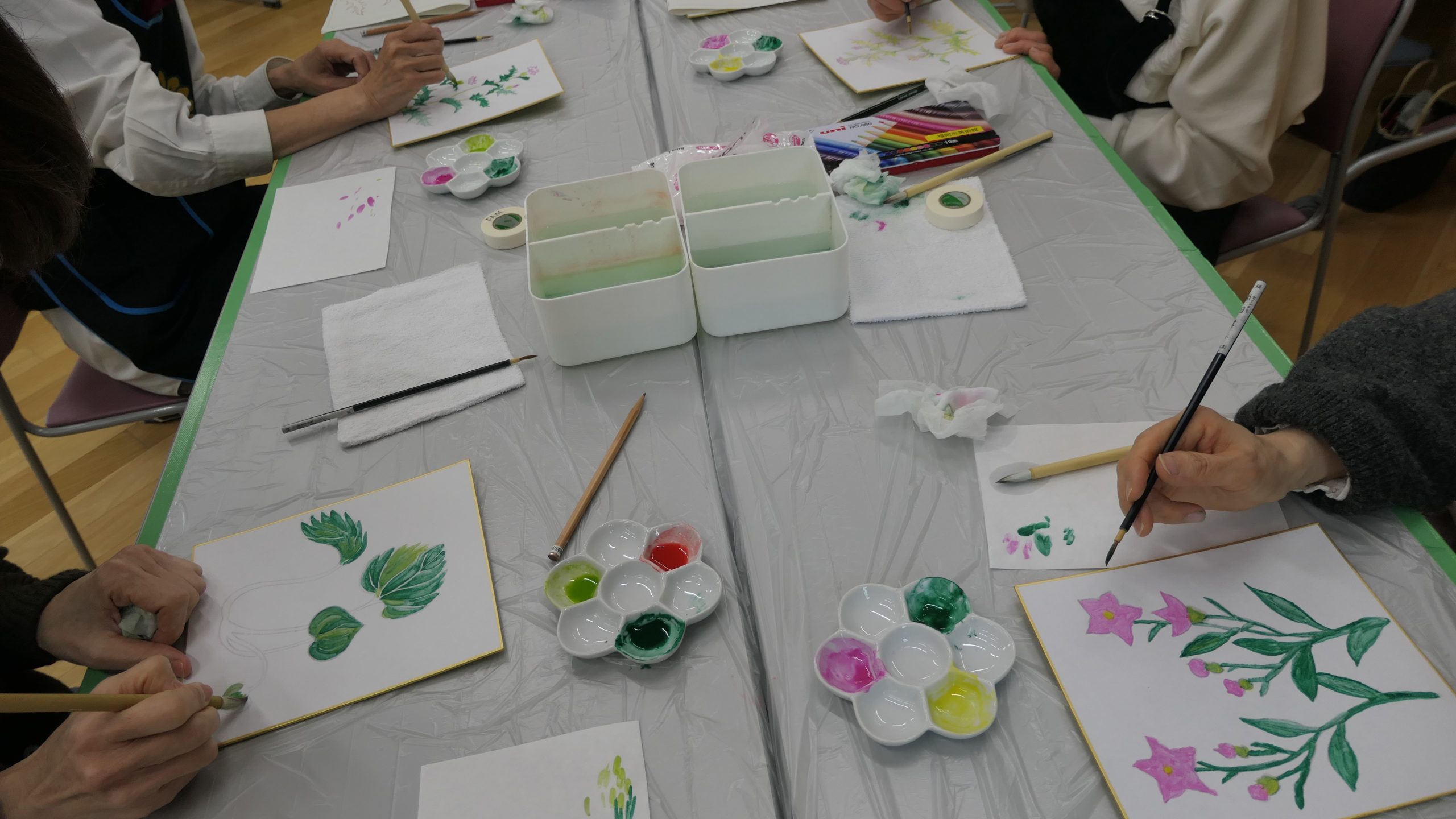 「私絵が下手なのよー。」と言われる参加者の方がいます。でも、大丈夫!日本画のプログラムでは、岩絵具の塗り心地を感じたり、自分のイメージに合わせて色を塗ったりすることに重点をおきます。参加者の方は、用意した6色の岩絵具の中から3色を選び塗ります。岩絵具と接着剤の役割となる膠(にかわ)を指で混ぜると、指の腹に岩絵具のザラザラした感触が伝わってきます。色数は少ないですが、イメージを膨らませて素敵な作品ができあがります。参加者の方はどんどん熱中して、部屋の中がシーンと静まり返ります。お互いの作品を見合う時間になると「◯◯さん、この色の組み合わせ良いわねー」と褒め言葉のキャッチボールが始まり、謙遜しつつもみなさんの顔はにっこりです。自然と部屋が和やかな雰囲気に包まれます。描くだけでなく他の方に見てもらって声をかけてもらうのも楽しみの一つです。