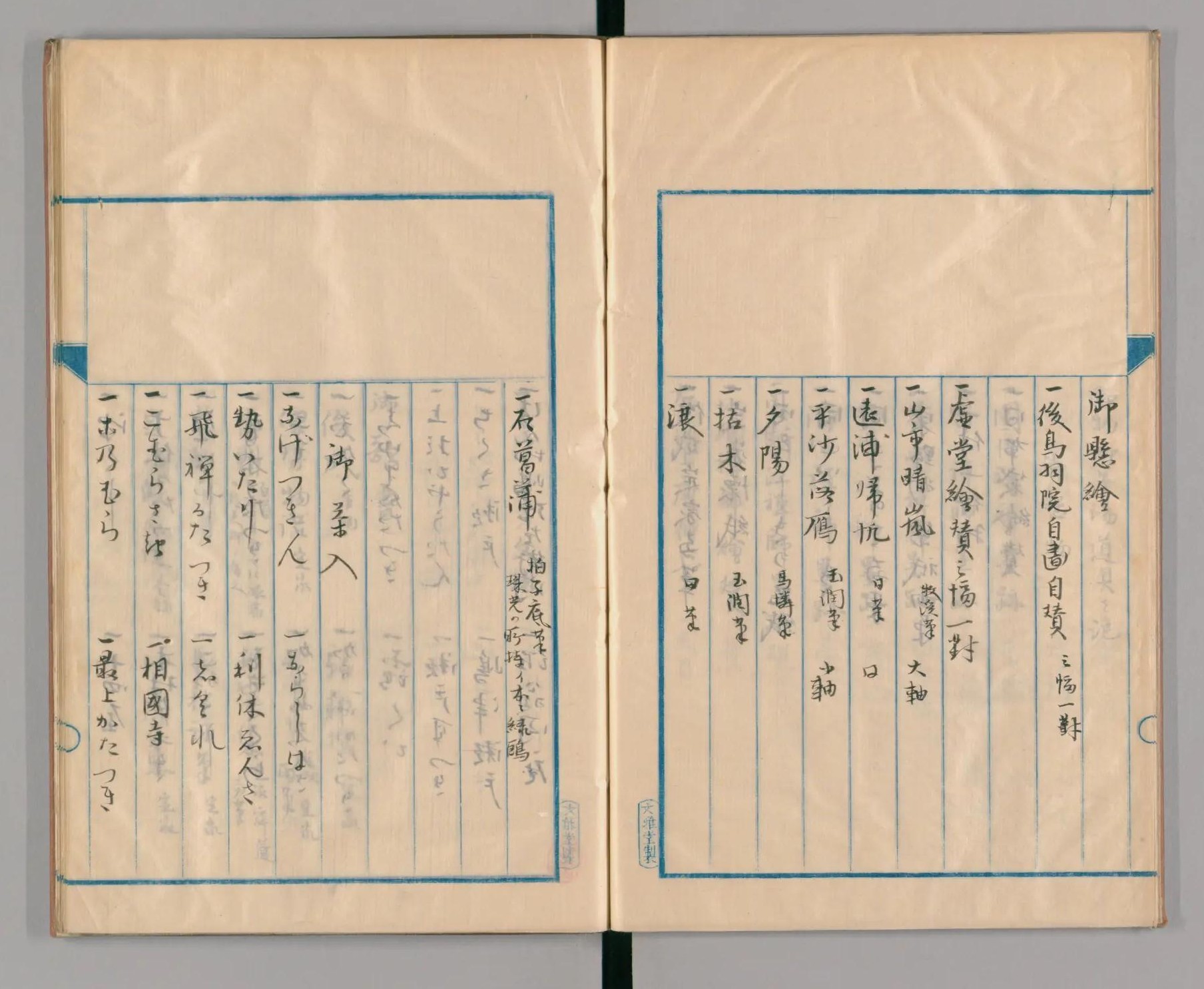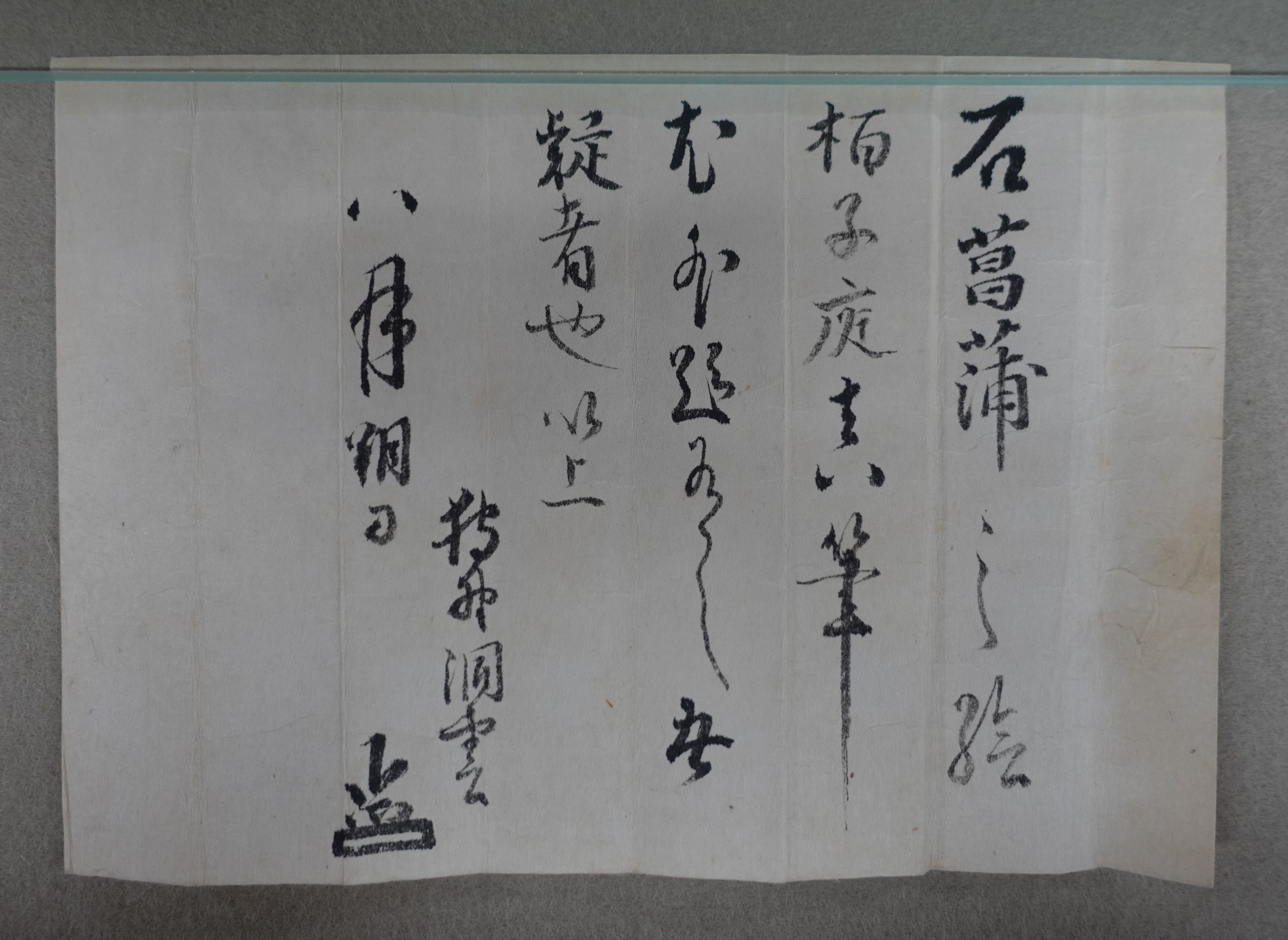 本外題は、「石菖蒲」に続けて「柏子庭筆 珠光乃所持」と記しており、ここから、侘茶の創始者ともいわれる珠光が所持していたことが分かります。これとの関連がうかがわれるのが、江戸時代の始めに流布していた名物目録を集約した『玩貨名物記』の記載です。
