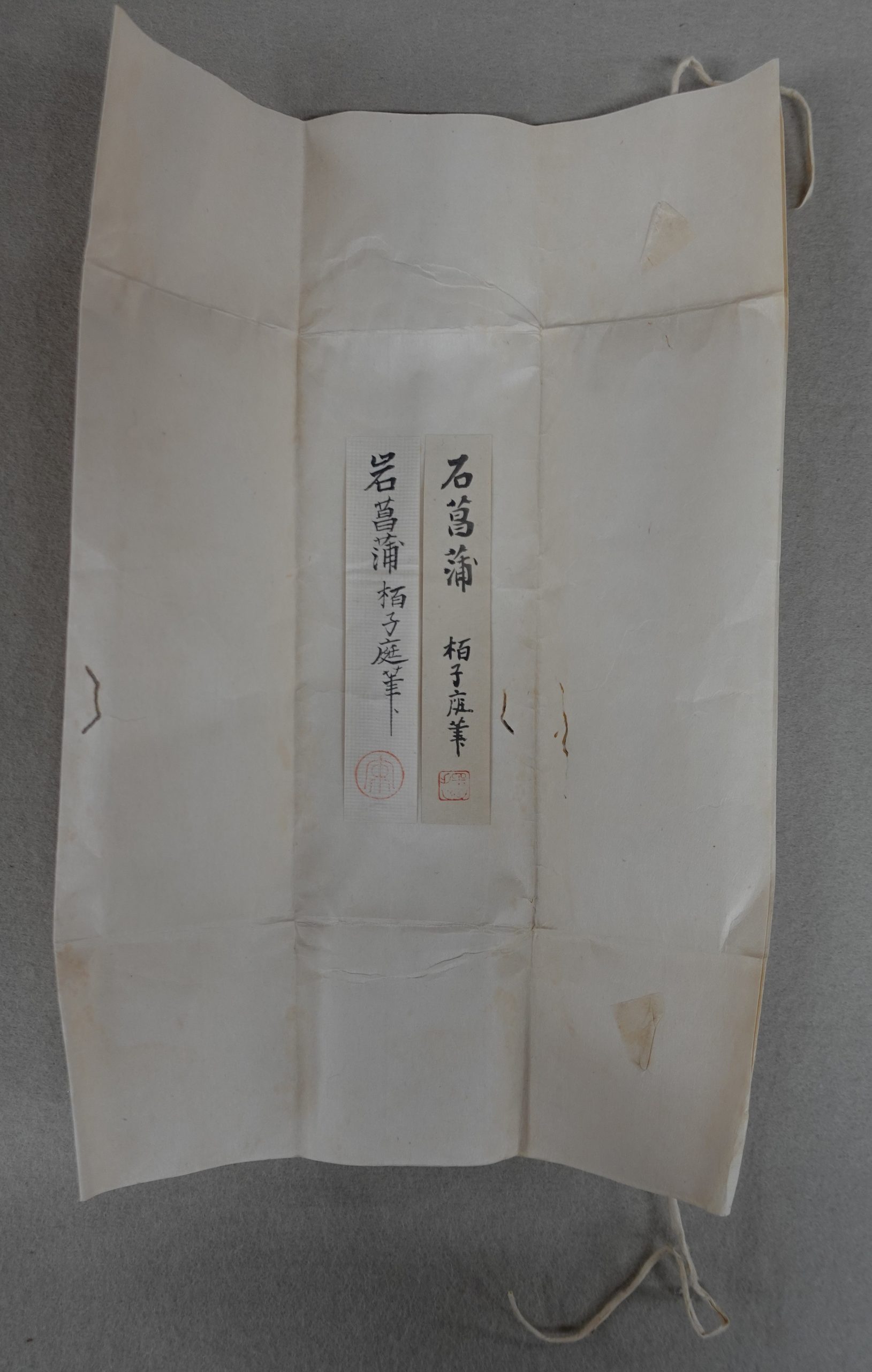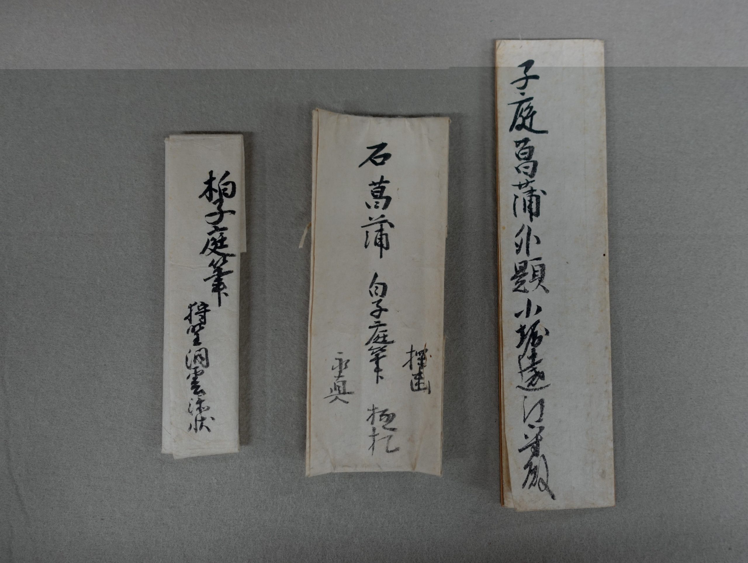 本外題は、「石菖蒲」に続けて「柏子庭筆 珠光乃所持」と記しており、ここから、侘茶の創始者ともいわれる珠光が所持していたことが分かります。これとの関連がうかがわれるのが、江戸時代の始めに流布していた名物目録を集約した『玩貨名物記』の記載です。