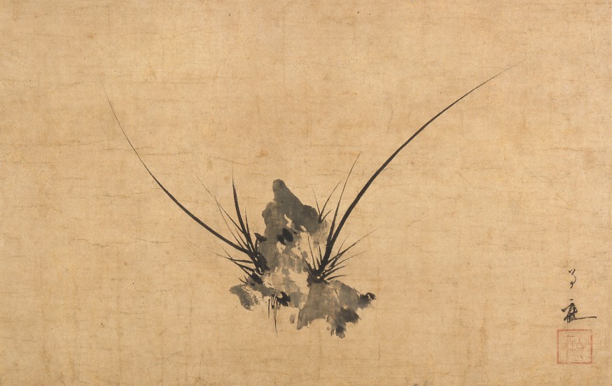 石菖とは、渓流の岩場に生える植物で菖蒲に似た葉を茂らすことからその名があります。画面右下には、作者をしめす落款印章があり、本作を手がけたのが元時代の禅僧画家、子庭祖柏であることが分かります。