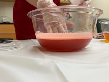 さらにクエン酸を入れて液を酸性にし、色素を安定させます。ビー玉を括りつけたり、輪ゴムで縛ったりしたハンカチをあらかじめ水につけておき、いよいよ赤い色素の沁みだした液の中につけると・・・思った以上に鮮やかな紅色!というよりピンク色に染まりました!良い意味で期待を裏切る可愛らしい色で、驚きがありました。