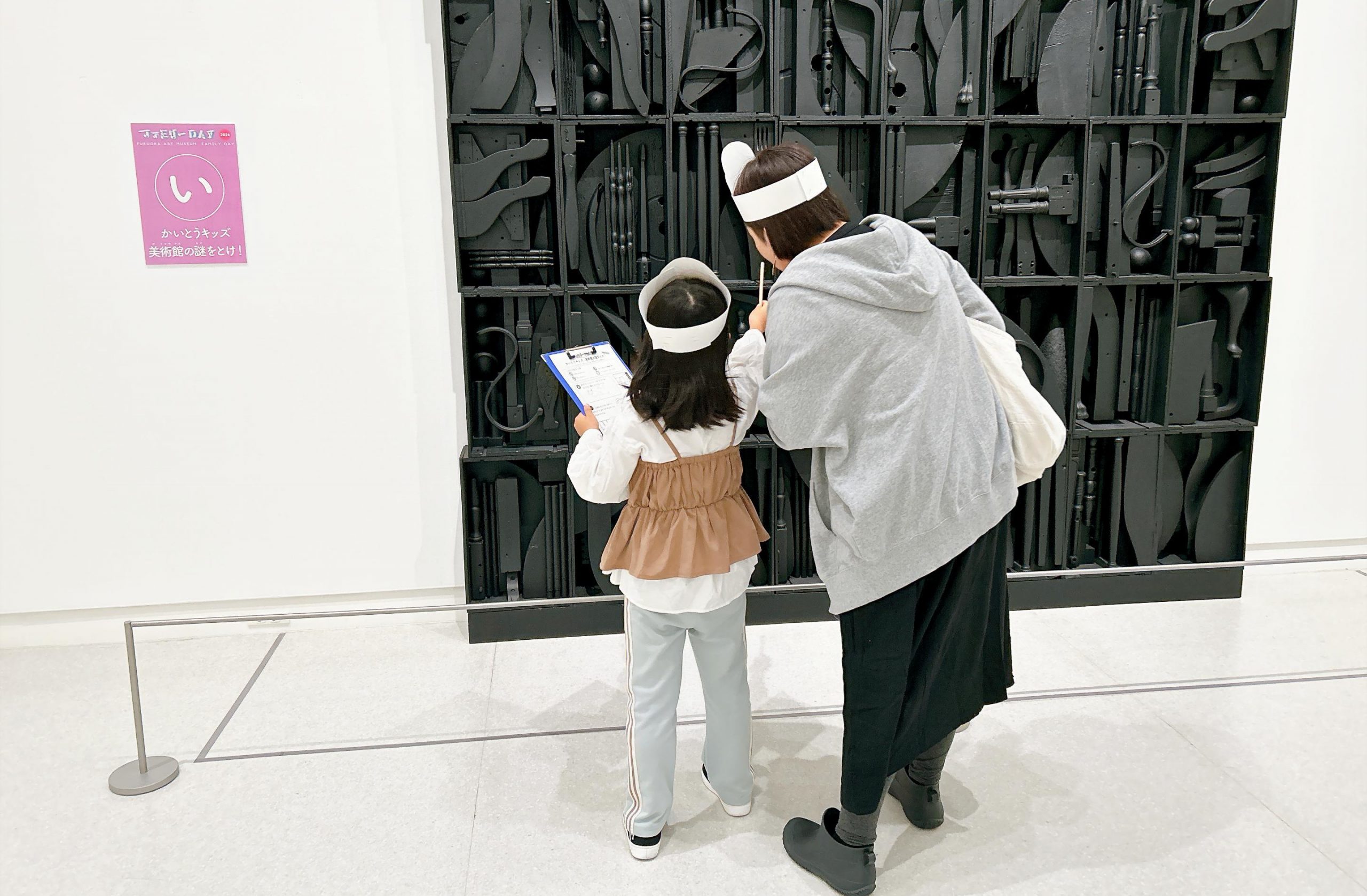 「かいとうキッズ 美術館の謎をとけ!」は、福岡市美術館の古美術から近現代美術までの幅広いコレクションを、美術館職員が考えたクイズを解きながら鑑賞していくプログラムです。クイズは「やさしい」と「むずかしい」の2種類があり、自分が挑戦したいほうを選べます。 さらに今年は、建築をテーマにした「たてものにかくされた記号をさがせ!」が登場!クイズは、建築好きな当館のボランティアさんたちと一緒に考えました。どちらも名探偵気分でクイズを解いていくことで、普段は気が付かない発見があるかもしれません。どんな発見をしたのか、ご家族で会話をしながら一緒に作品鑑賞をしてみてくださいね。