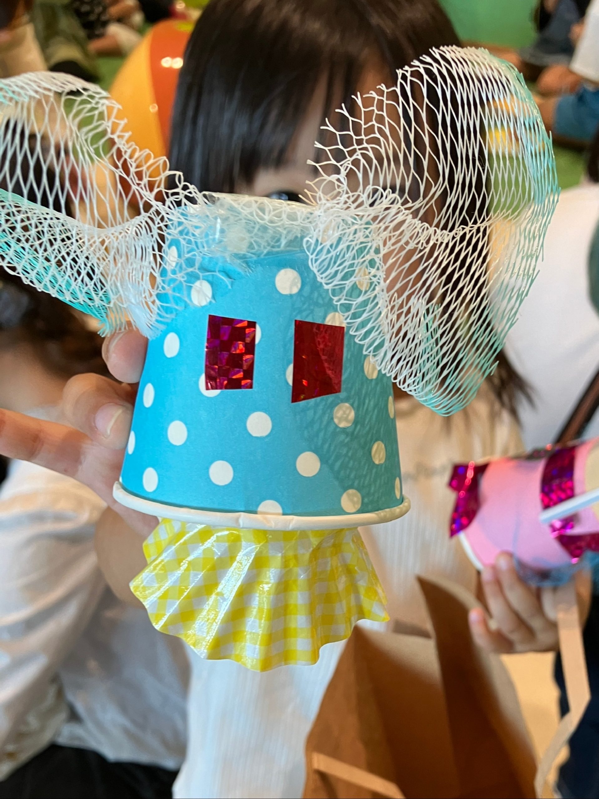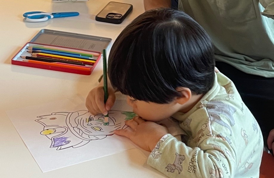 夢中になってお面に色を塗っています