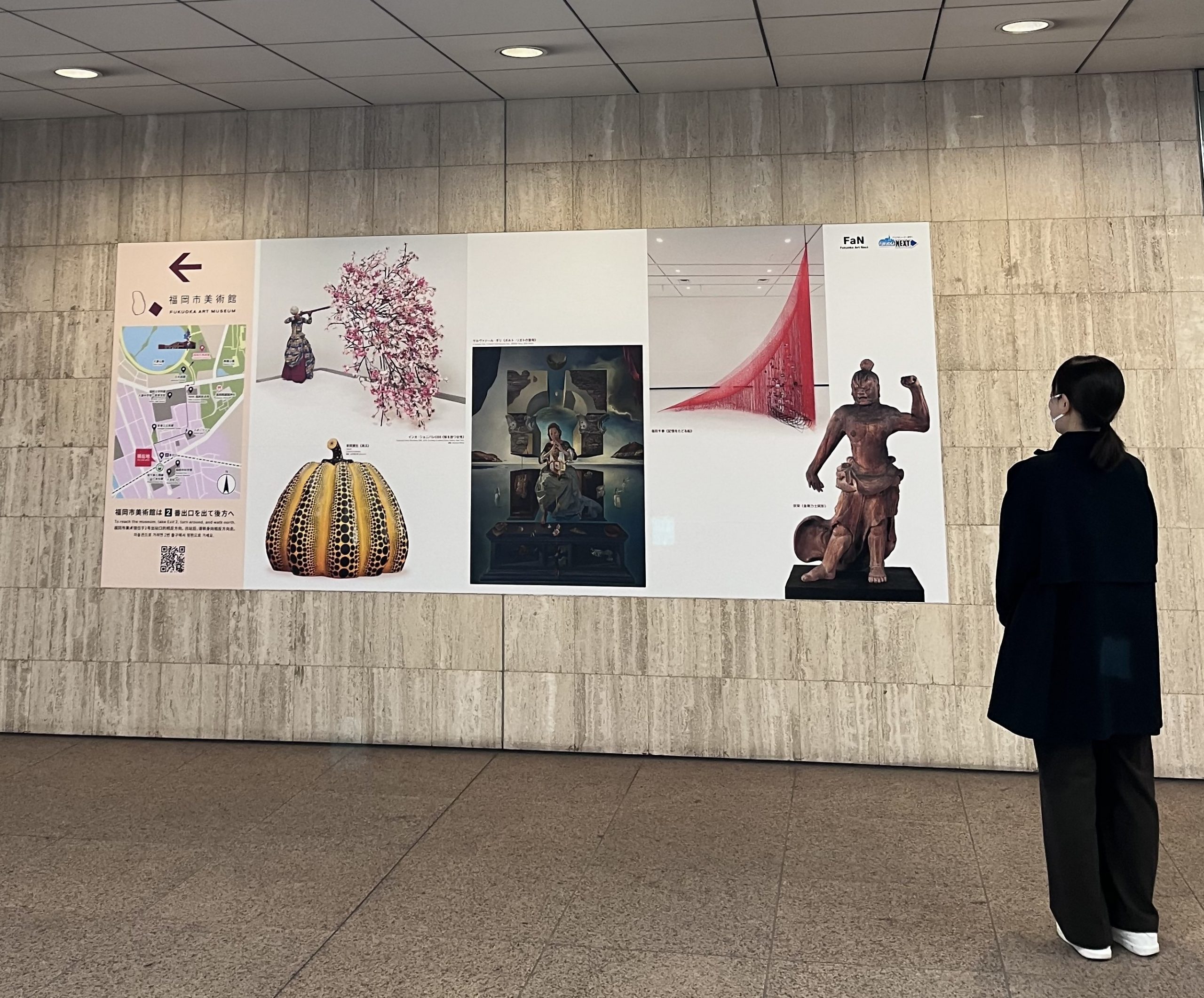 令和8年3月10日(火)から、福岡市美術館の最寄り駅である福岡市地下鉄六本松駅の壁面装飾をリニューアルいたしました。 リニューアル前よりも面積を拡大し、美術館のコレクションの中から、インカ・ショニバレCBE《桜を放つ女性》、草間彌生《南瓜》、サルヴァドール・ダリ《ポルト・リガトの聖母》、塩田千春《記憶をたどる船》、宗栄《金剛力士阿形》らスター作品を入れ込んだデザインにしております。 リニューアルした壁面装飾を六本松駅でご覧になった後は、ぜひ福岡市美術館へご来館お待ちしております。